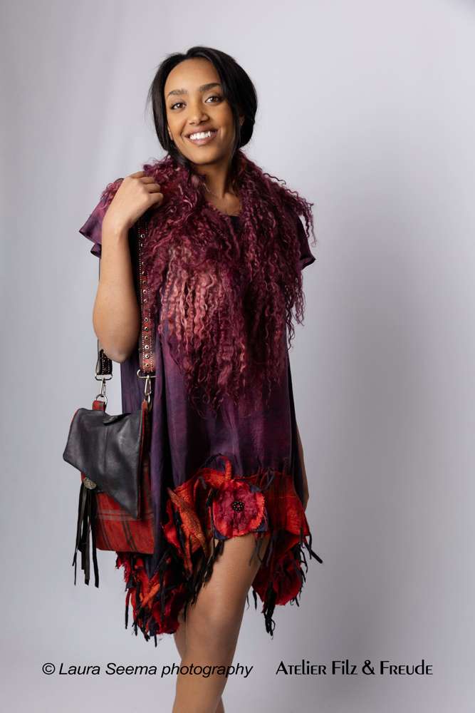 Wir bieten handgefilzte Kleidungsstücke für alle Jahreszeiten, Unikate aus Schafwoll- Locken, handgefärbte Seide, individuelle Re-Fashion-Kreationen und weitere textile Kunstwerke.